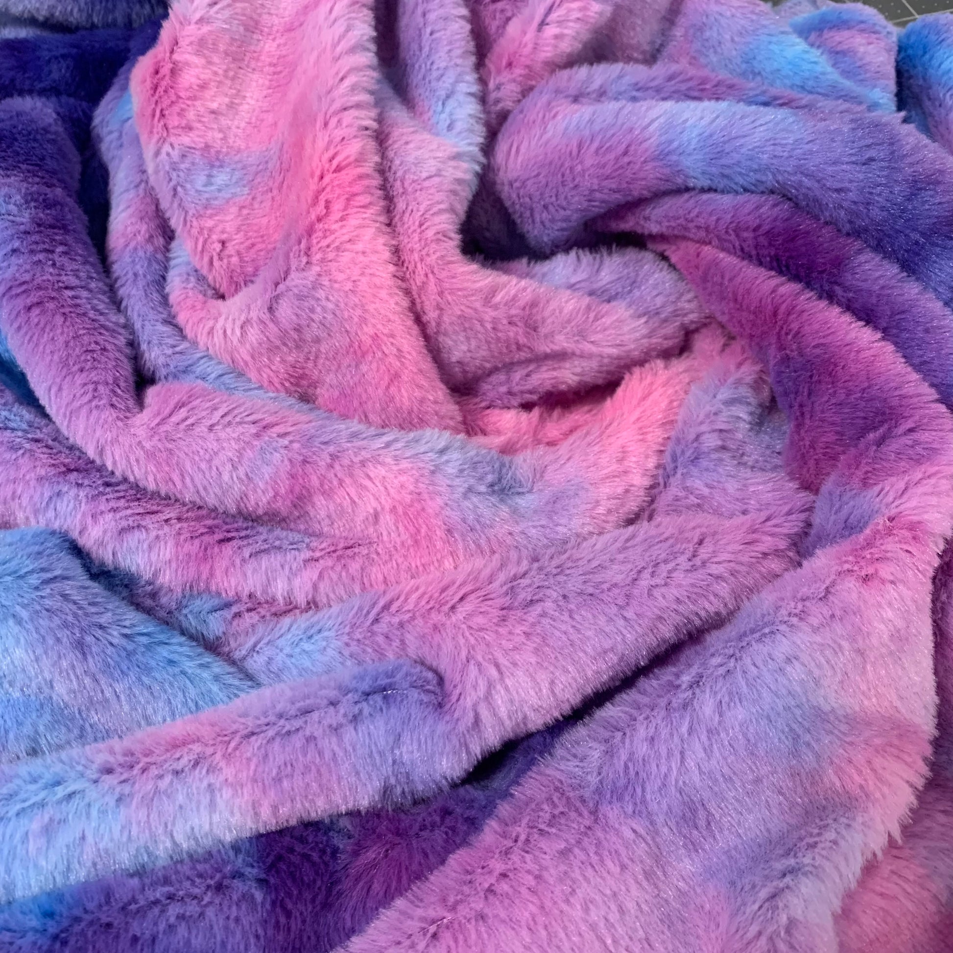 This Tie Dye Faux Rabbit Fur plush polyester fabric is luxuriously soft and two-way stretchable, perfect for making garments and accessories for costumes or everyday wear. Its super-soft texture ensures maximum comfort and durability.