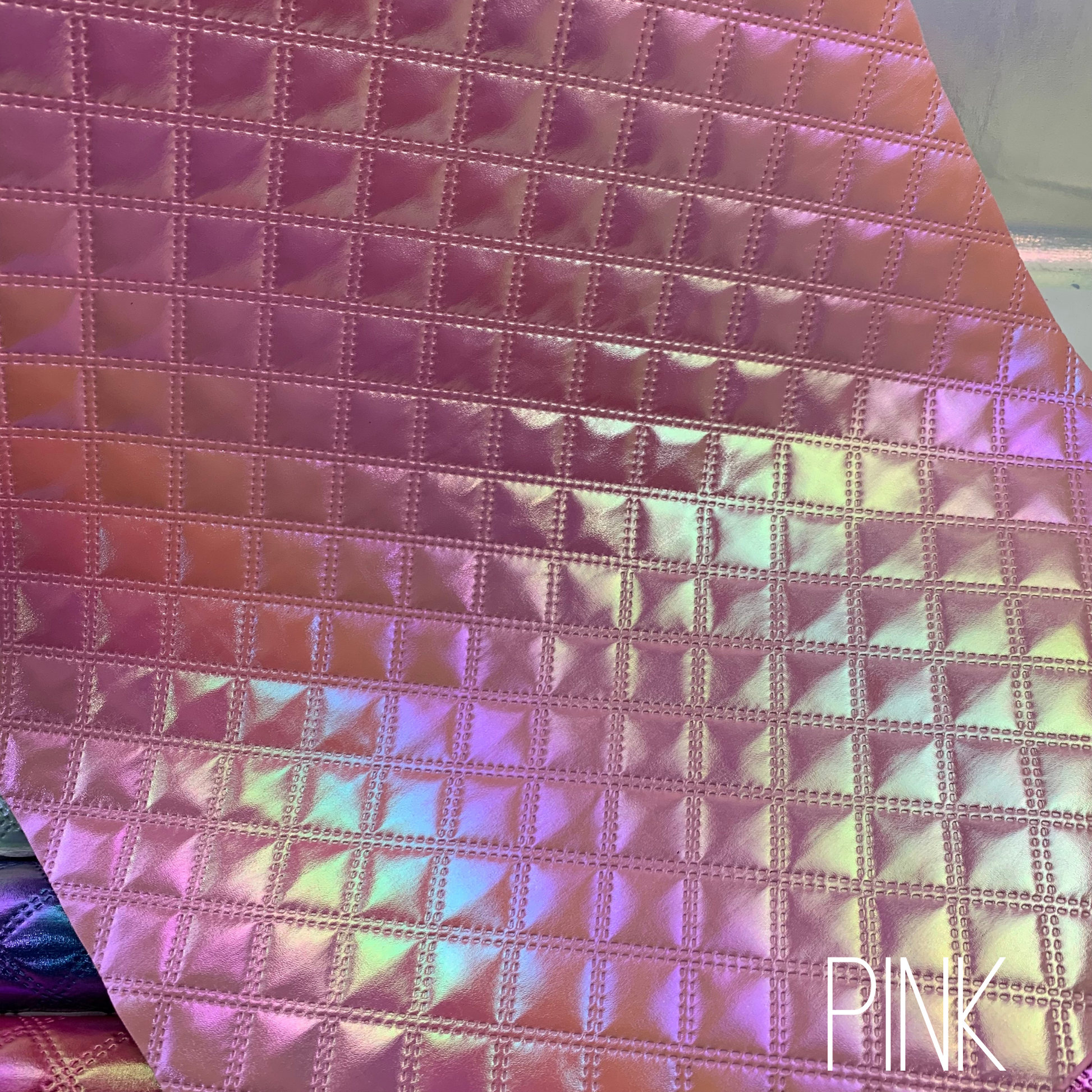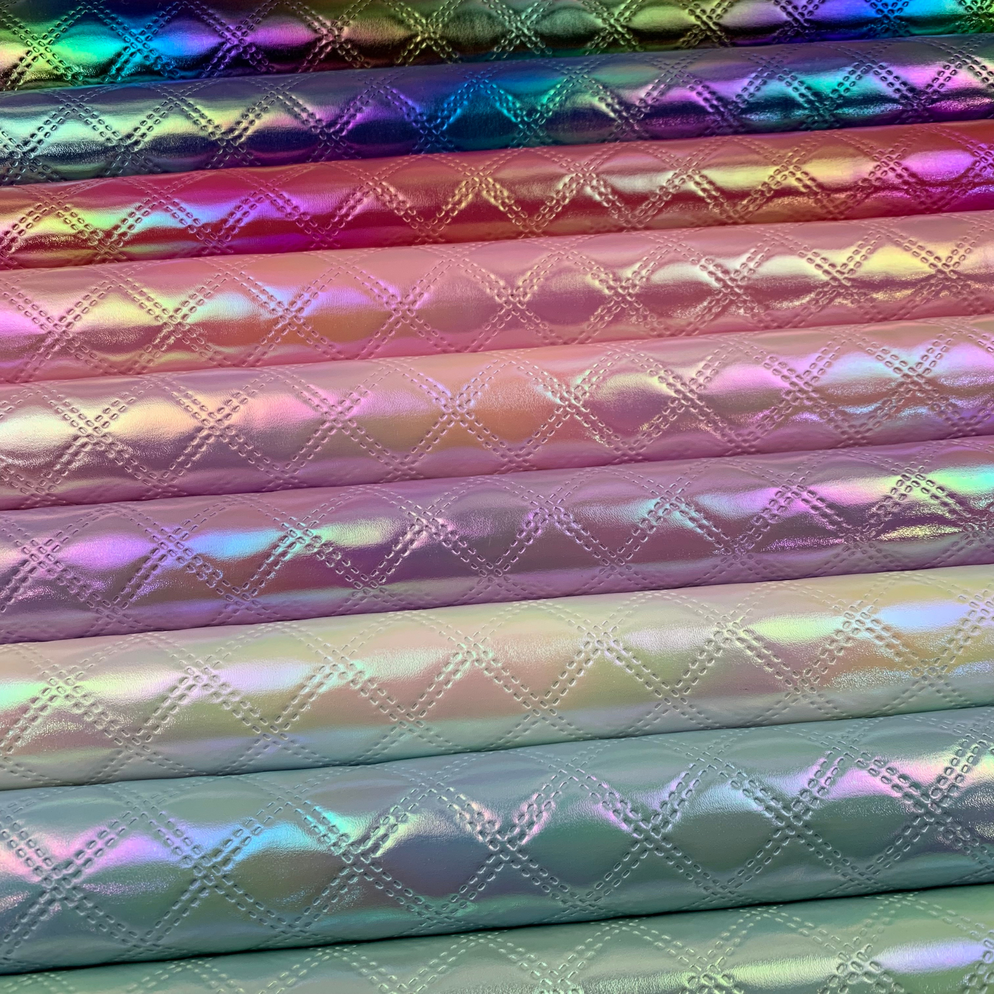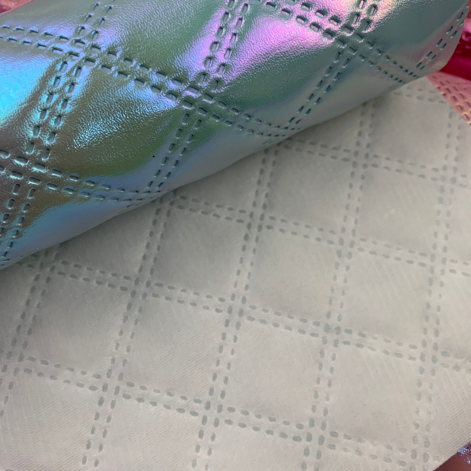 Experience the unique beauty of our Diamond Iridescent Quilted Faux Leather. This product boasts a stunning iridescent effect, perfect for adding dimension and shine to any project. The quilted pattern, achieved through an embossed process, adds a touch of elegance and texture. Perfect for handbags, backpacks, and more.