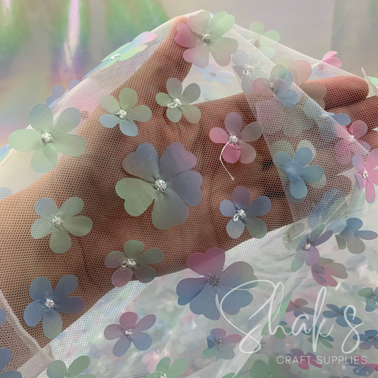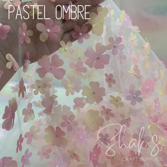 Pastel Ombre 3D Flower Embroidery Mesh Two Way Stretch Fabric