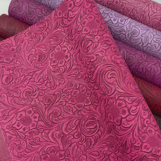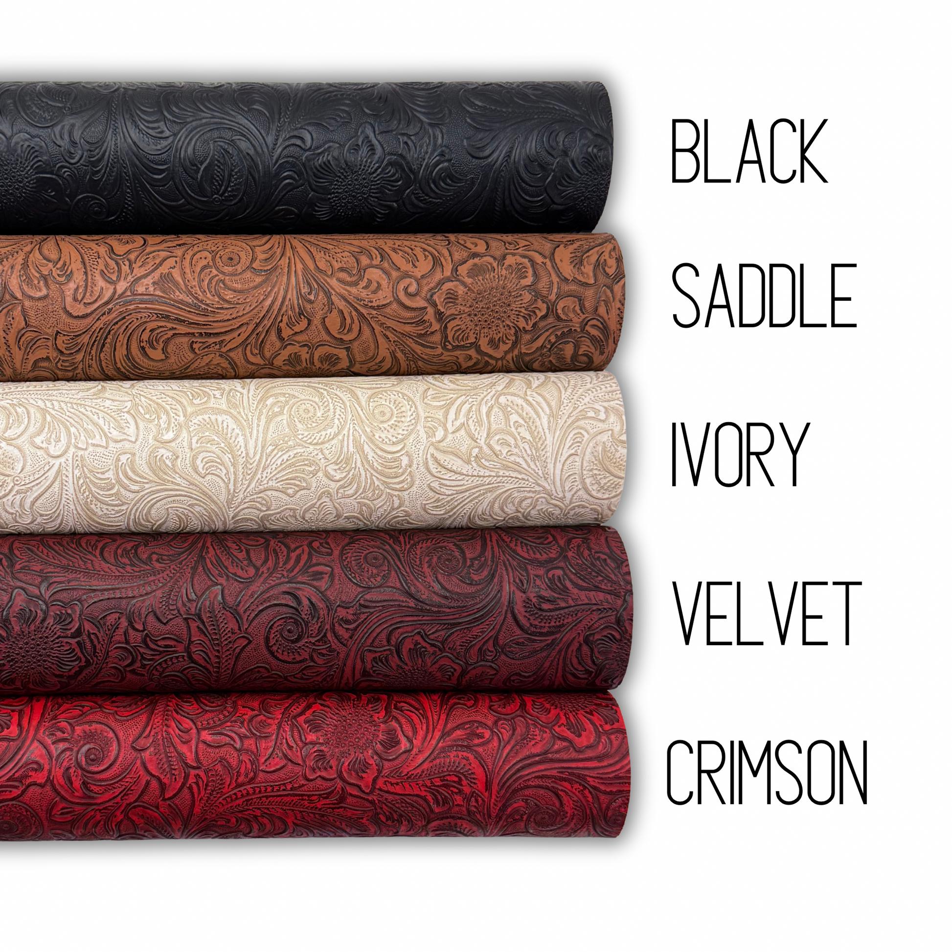 This embossed faux leather features an ornate floral scroll design with a raised, textured surface that mimics hand-tooled leather. Available in a curated range of rich solids and soft neutrals, the material offers visual depth, flexibility, and durability. Ideal for bags, fashion accessories, home décor, and craft applications.