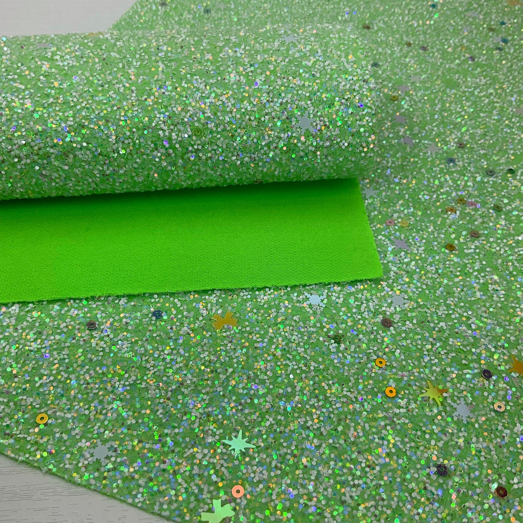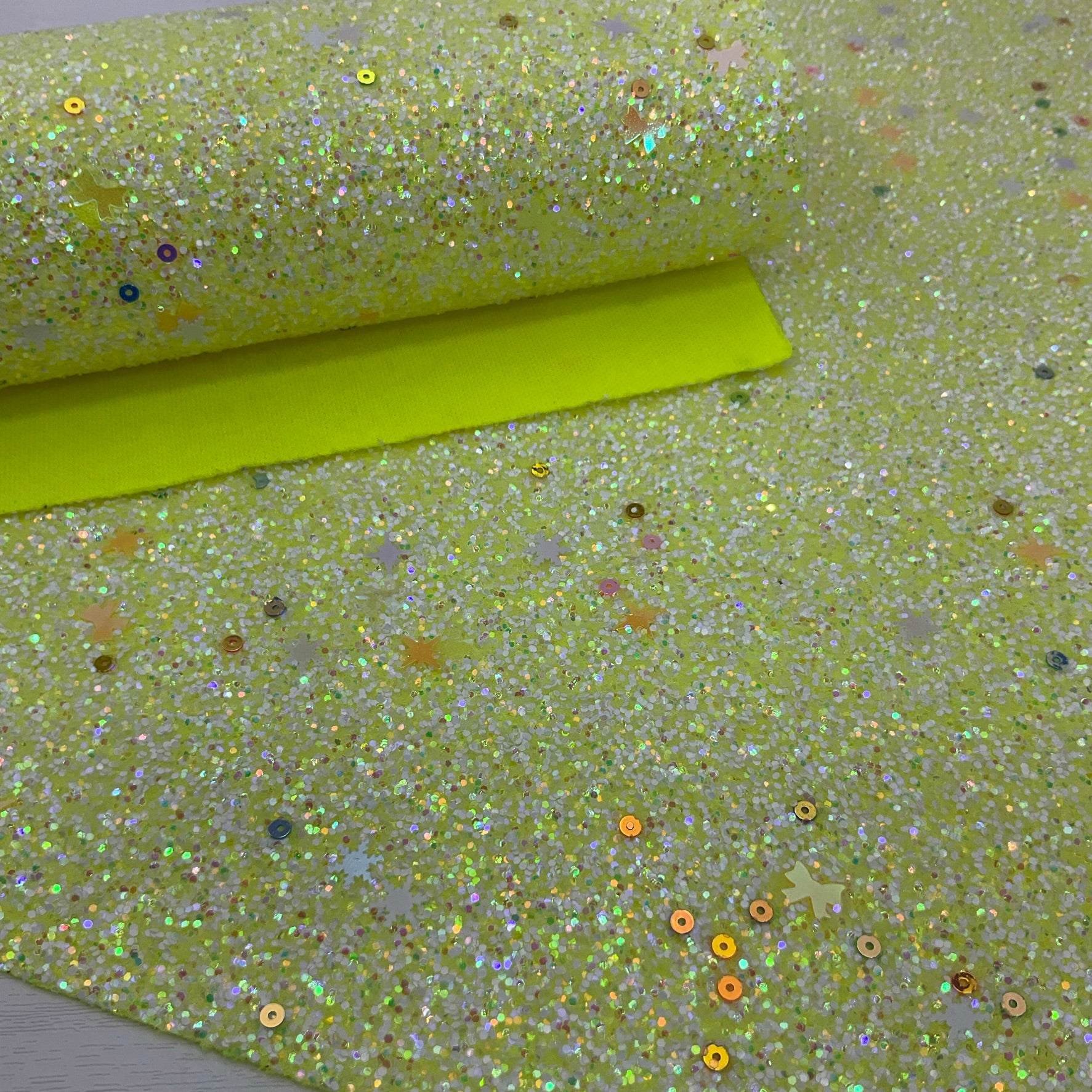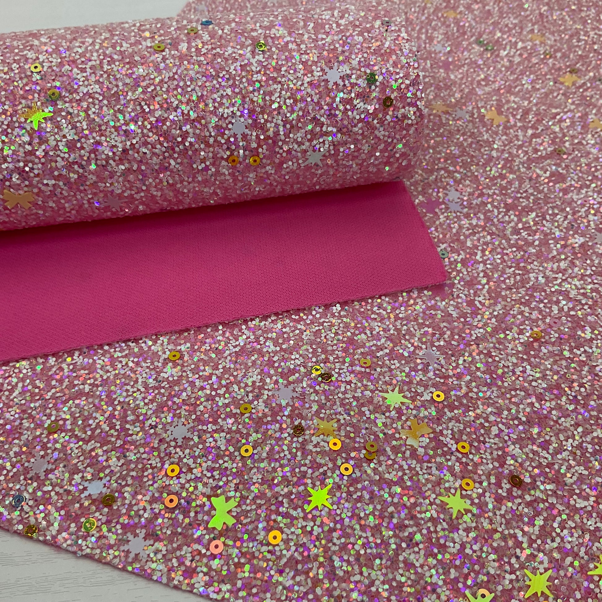 TYPE: Chunky Glitter with matching color polyester backing (this backing has a little 2-way stretch)