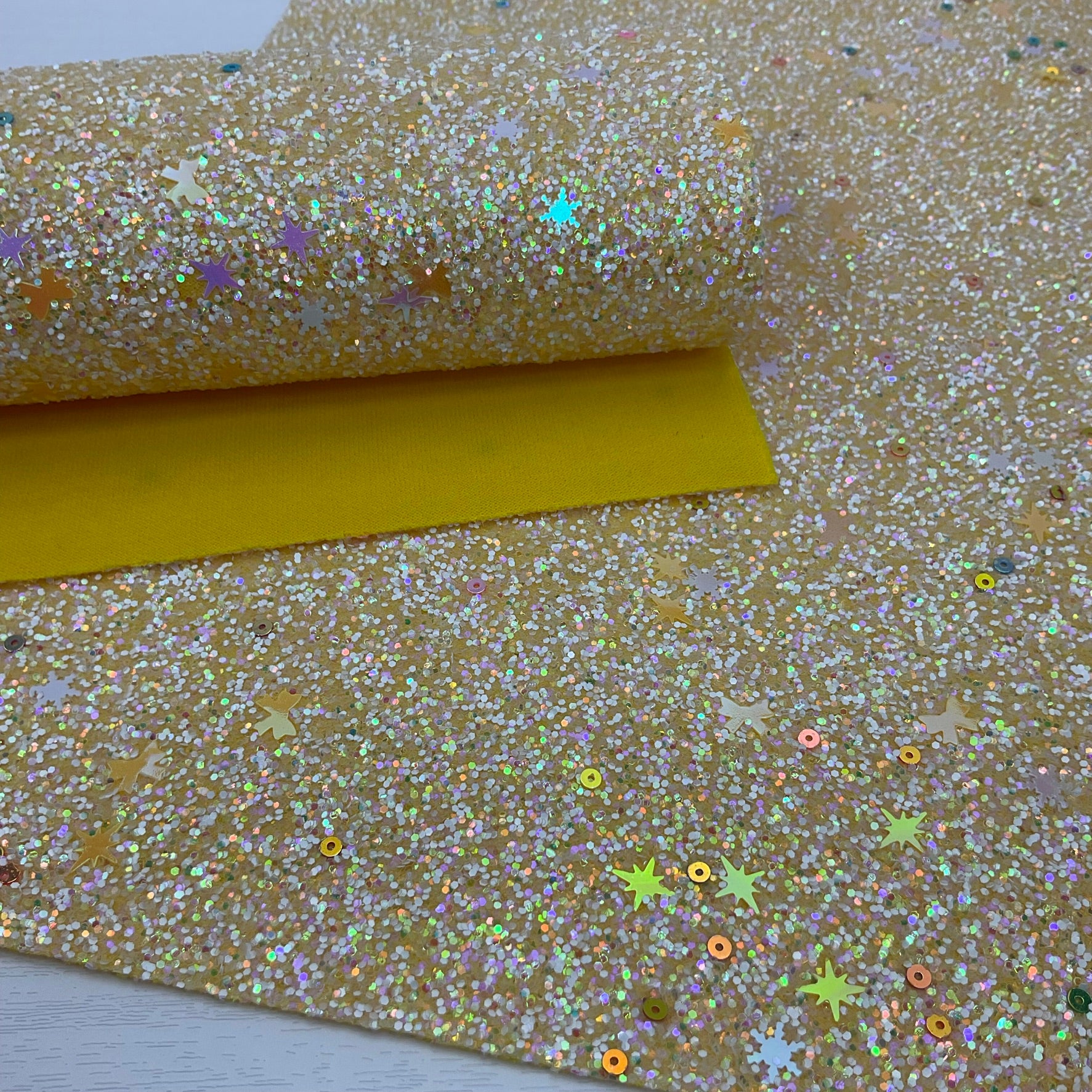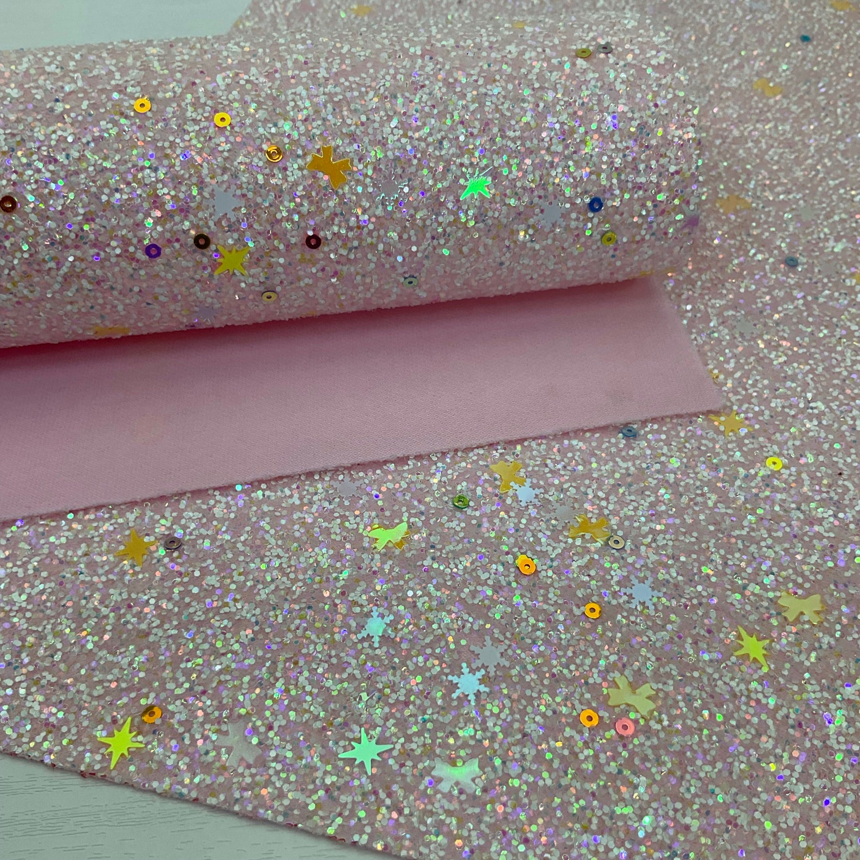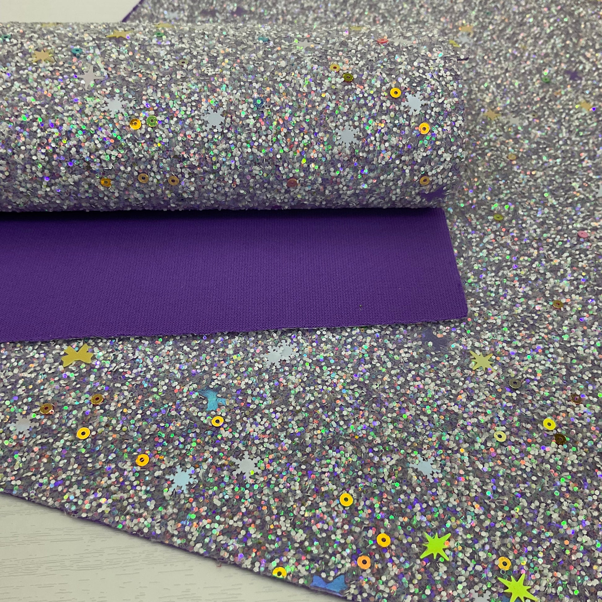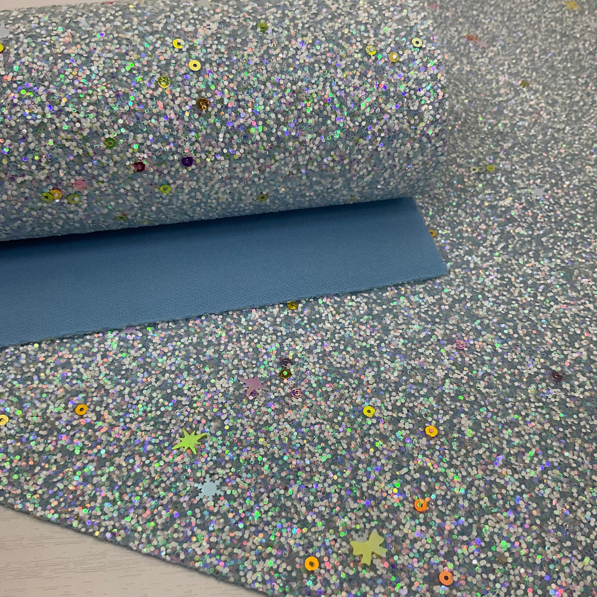 TYPE: Chunky Glitter with matching color polyester backing (this backing has a little 2-way stretch)