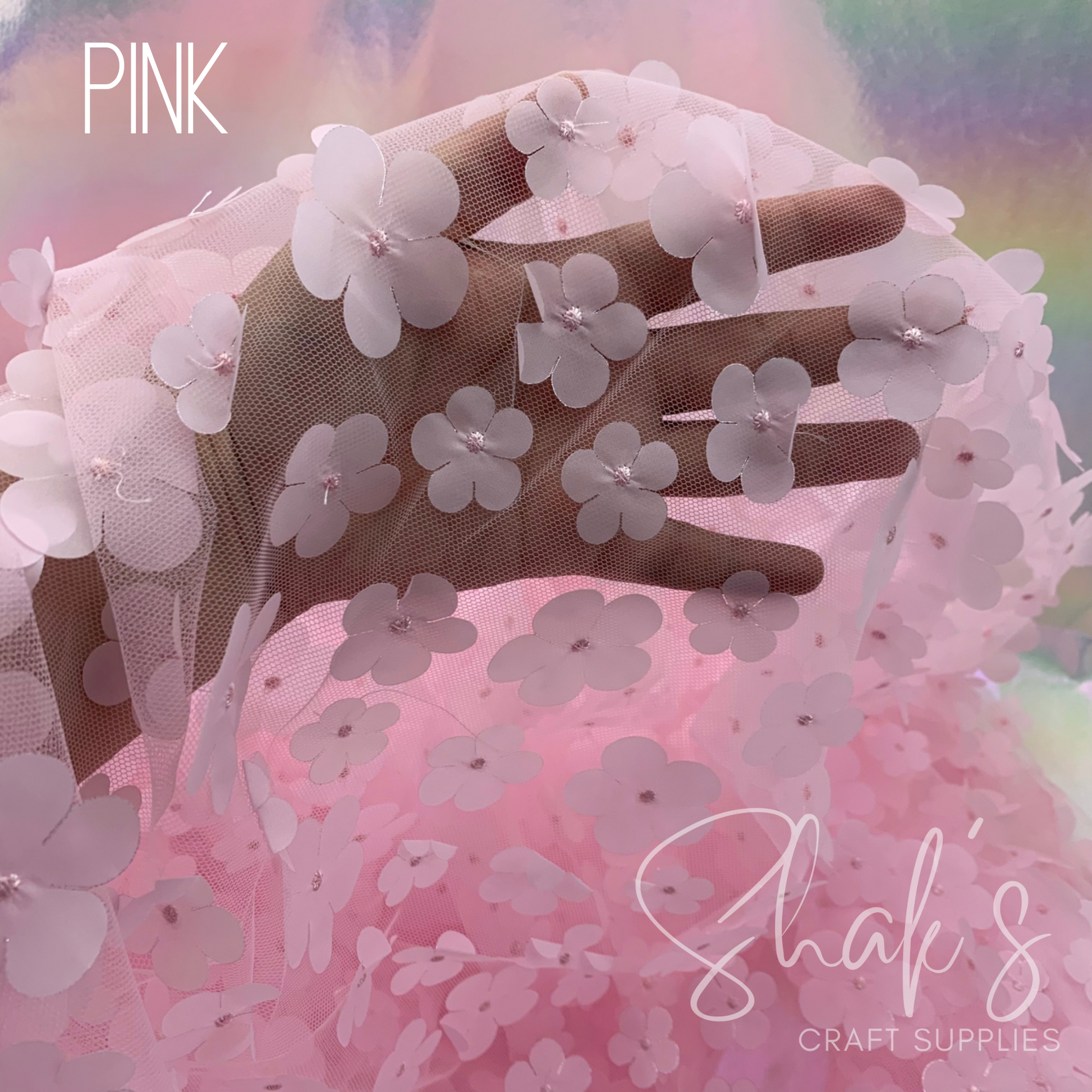 Pink 3D Flower Embroidery Mesh Two Way Stretch Fabric